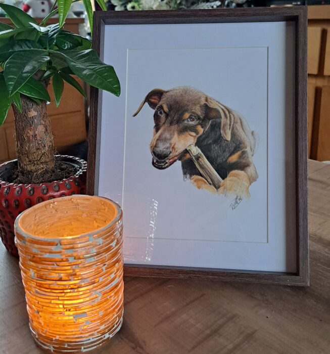 Laika februari 20, 2026 | Geen reacties Deze knappe dame hoor ik alleen maar fijne berichten over. Helaas is ze vrij plotseling en veel te vroeg overleden. Aan mij om er een mooie herinnering van te maken. Uncategorized | Tags:dierbaar, dierentekeningen, herinnering, hond, kleurpotlood, portret
